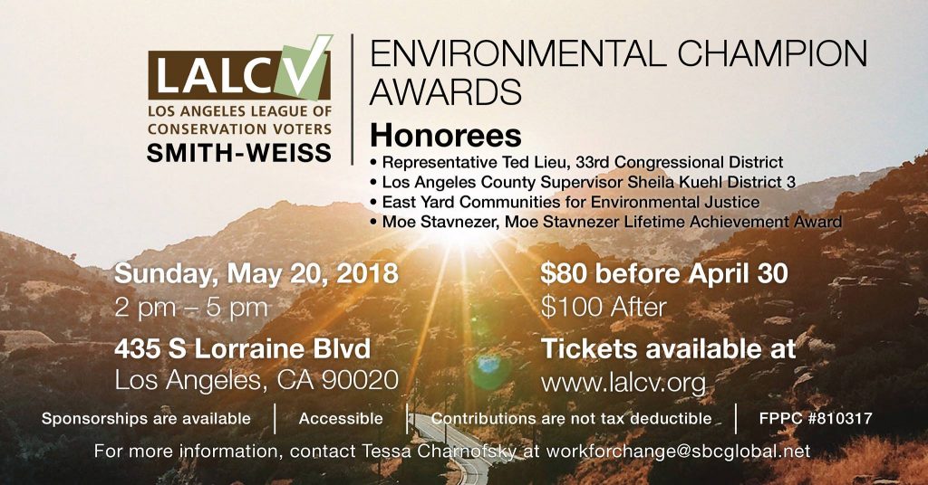 LALCV Presents: Smith-Weiss Environmental Champion Awards May 20, 2018May 4, 2018 Robin Shank Loading Map.... LALCV435 S. Lorraine Blvd - Los AngelesEvents 34.0661057 -118.32037350000002 Date/Time Date(s) - 05/20/20182:00 pm - 5:00 pm Location LALCV Categories Other Event Smith-Weiss Environmental Champion Awards Tickets: $100 and up Information HERE