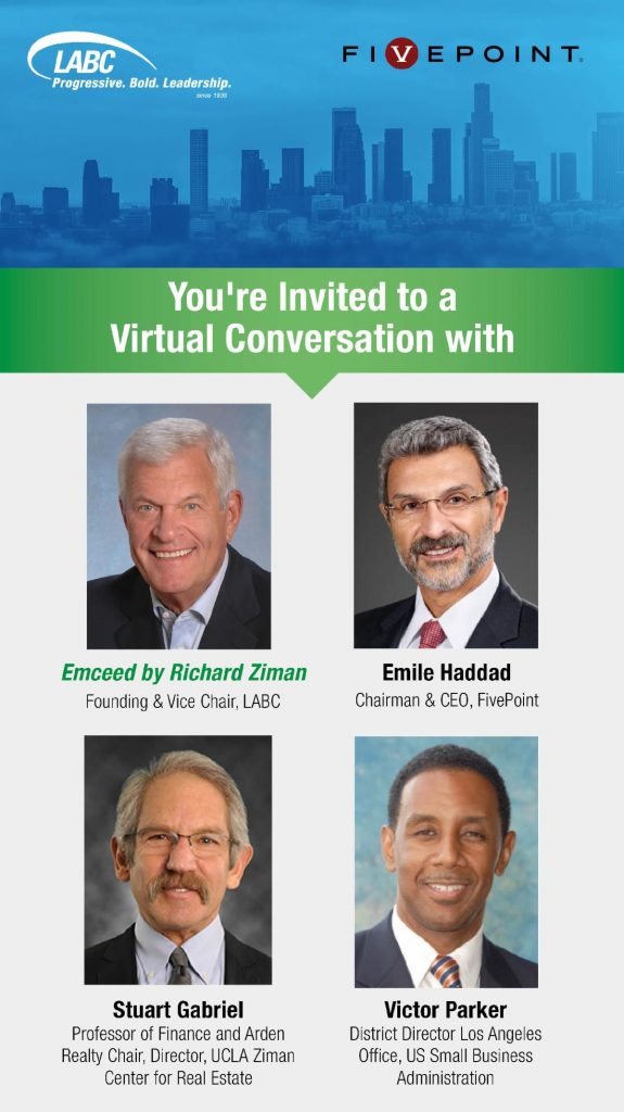 Join the LABC as we hear from leading public, private, and academic leaders on the impact of COVID-19 on our region’s economy. FivePoint Chairman and CEO, Emile Haddad, will present the public health emergency’s effect on the residential and commercial real estate market, while Stuart Gabriel, Director of the UCLA Ziman Center for Real Estate, provides an economic forecast for Los Angeles. We will also hear from Victor Parker, Director of SBA’s Los Angeles District Office, on the current status of the Paycheck Protection Program and small business resources.