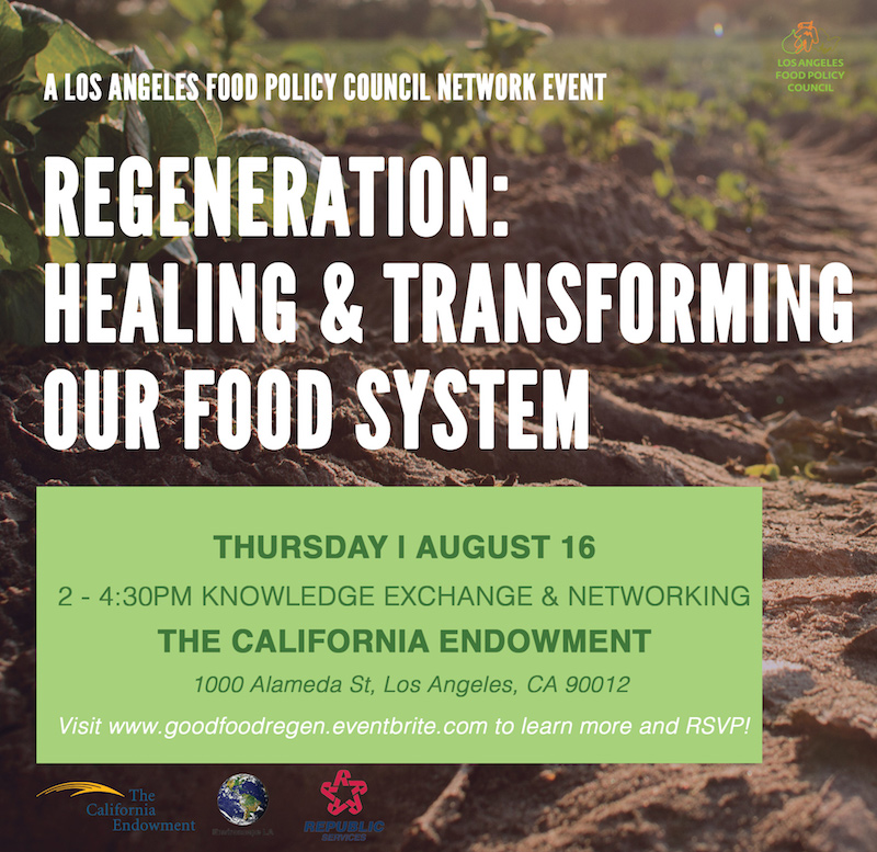 The Los Angeles Food Policy Council invited you to join us for “Regeneration: Healing and Transforming our Food System” on August 16, 2018 at the California Endowment Center. Learn about the concept of regeneration and how it applies to your work as a member of the Good Food movement.