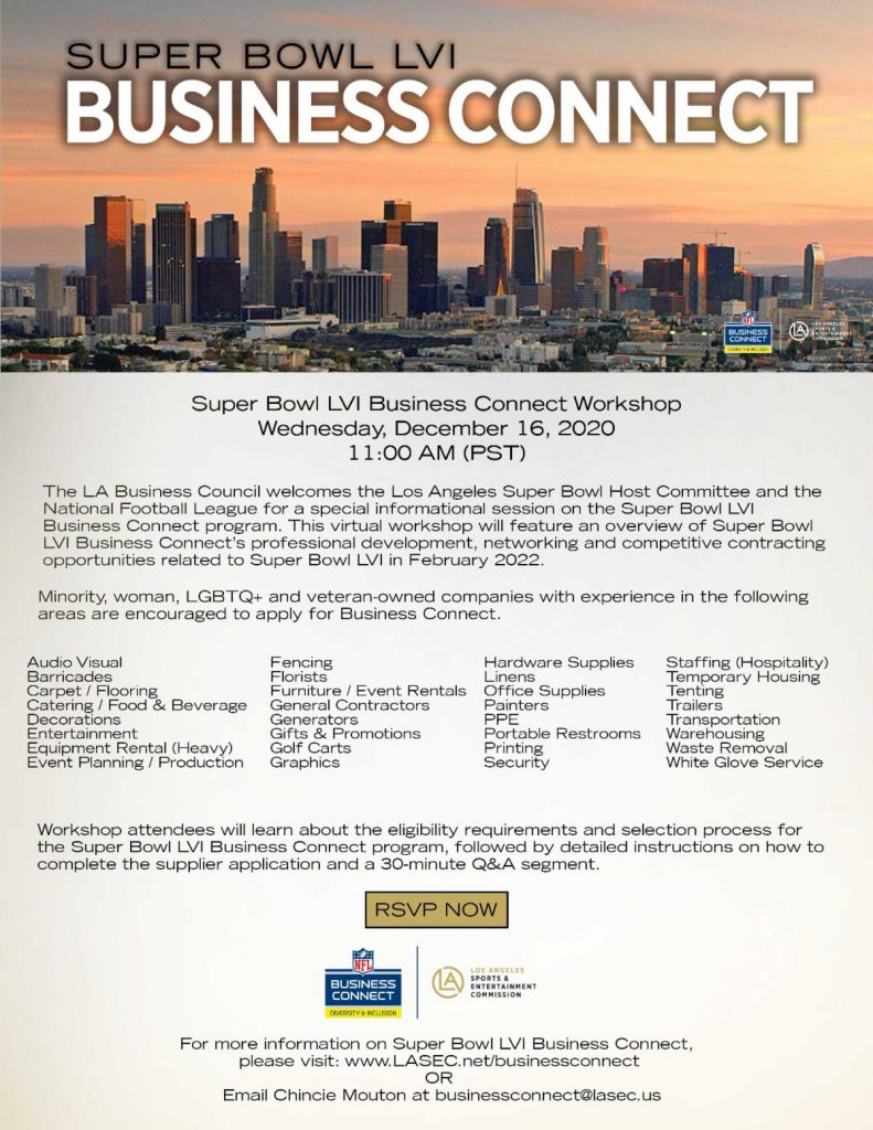 The Los Angeles Business Council welcomes the Los Angeles Super Bowl Host Committee and the National Football League for an informational session on the Super Bowl LVI Business Connect program.