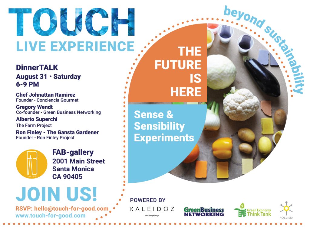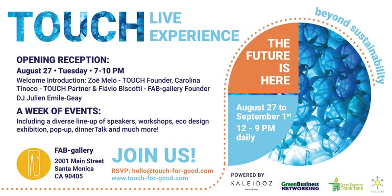 Join TOUCH at FAB-gallery on August 27 to Sept 1st for an unparalleled gathering of visionary thinkers, entrepreneurs, designers, culture makers, and change agents coming together to share the wisdom of social and environmental responsibility and take tangible action on some of the most important subjects of our time.