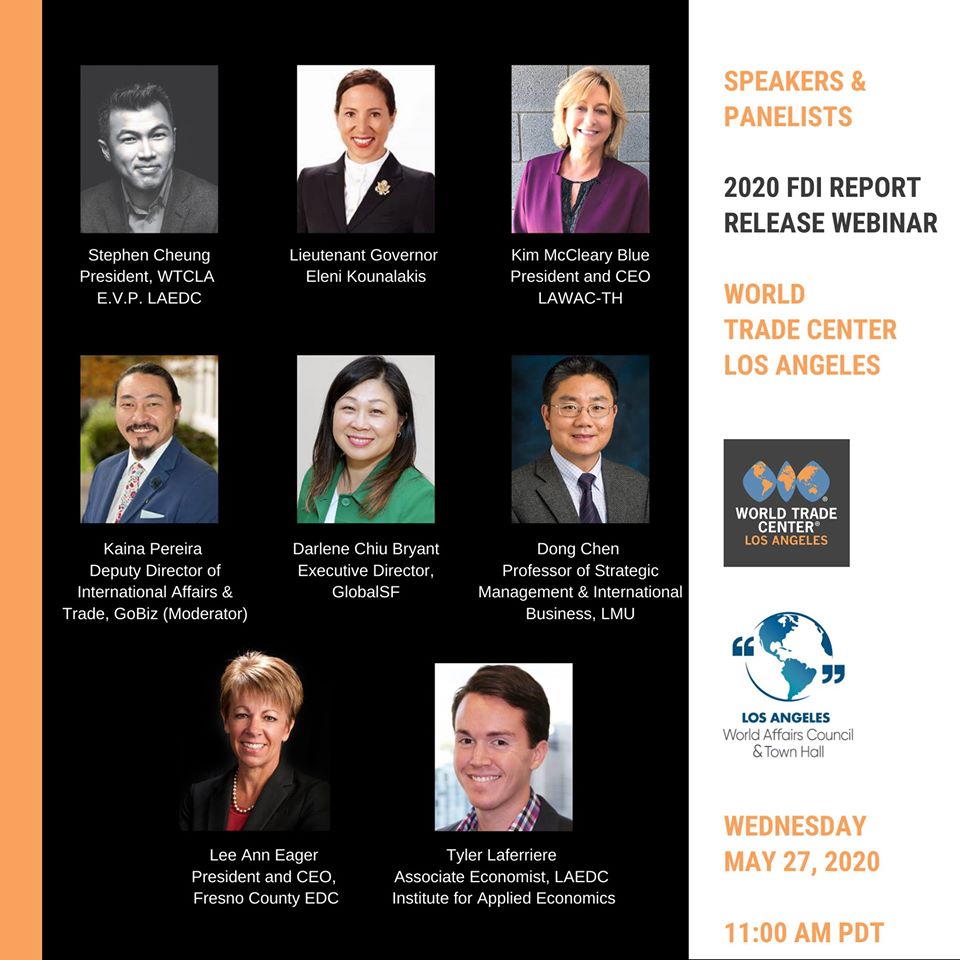 On Wednesday, May 27, 2020, the World Trade Center Los Angeles (WTCLA) and the Los Angeles World Affairs Council – Town Hall (LAWACTH) will host a free webinar that presents WTCLA’s 2020 Foreign Direct Investment Report that covers the entire State of California. The webinar will include a one-on-one discussion with California’s Lieutenant Governor Eleni Kounalakis, and a panel discussion with the report’s researchers and economic development representatives from around the state.